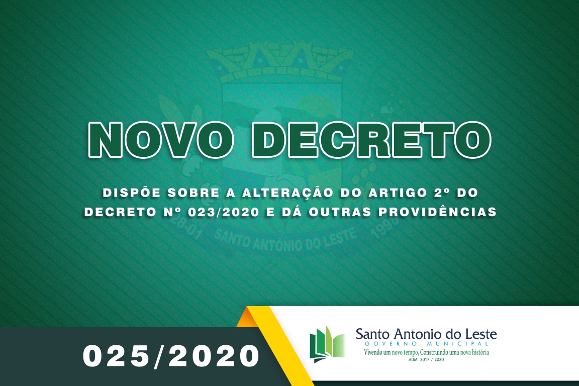 Considerando as determinações contidas nos Decretos Municipais realizados anteriormente, que dispõem sobre a adoção, no âmbito da Administração Pública Direta e Indireta do Município de Santo Antônio do Leste, Mato Grosso, de medidas temporárias e emergenciais de prevenção de contágio pelo coronavírus, o Prefeito em exercício, José Arimateia, realiza novo decreto, para fins de alteração do artigo 2º do Decreto nº 023/2020 e estabelece novas medidas a serem tomadas e mantidas a partir do dia 26/03/2020 a 05/04/2020.