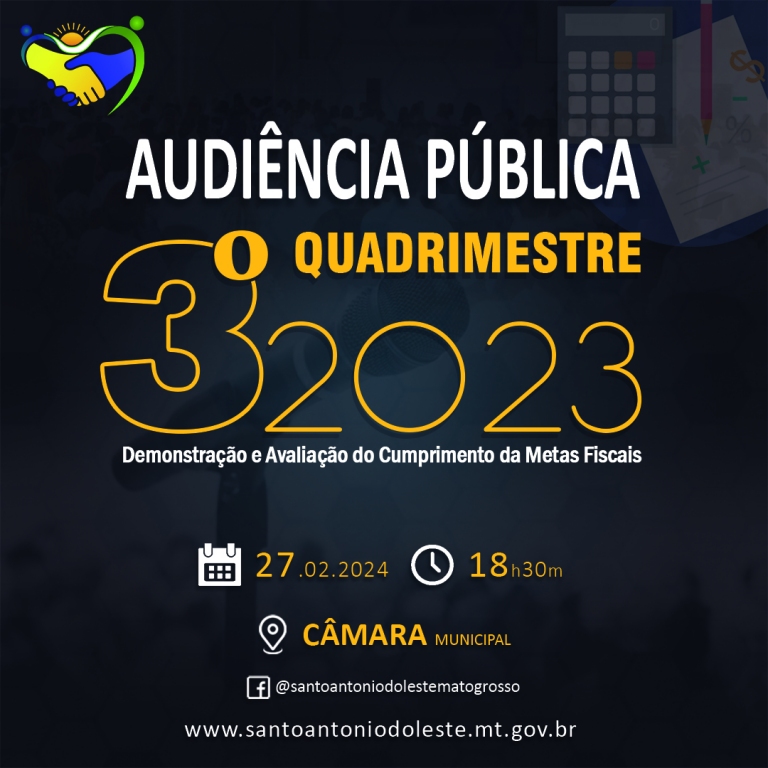 O Excelentíssimo Prefeito Municipal, Senhor José Arimateia Vieira Alves, convida a população de Santo Antônio do Leste–MT, para participar da Audiência Pública de Demonstração e Avaliação do Cumprimento das Metas Fiscais, referente ao 3º Quadrimestre de 2023, que será realizada no dia 27 de fevereiro do corrente ano (2024), às 18:30 horas, no Plenário da Câmara Municipal.