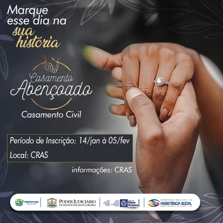 A Prefeitura Municipal de Santo Antônio do Leste, por meio da Secretaria de Assistência Social e do CRAS, informa que estão abertas as inscrições para o Casamento Comunitário 2026, uma importante ação social voltada ao fortalecimento dos vínculos familiares.