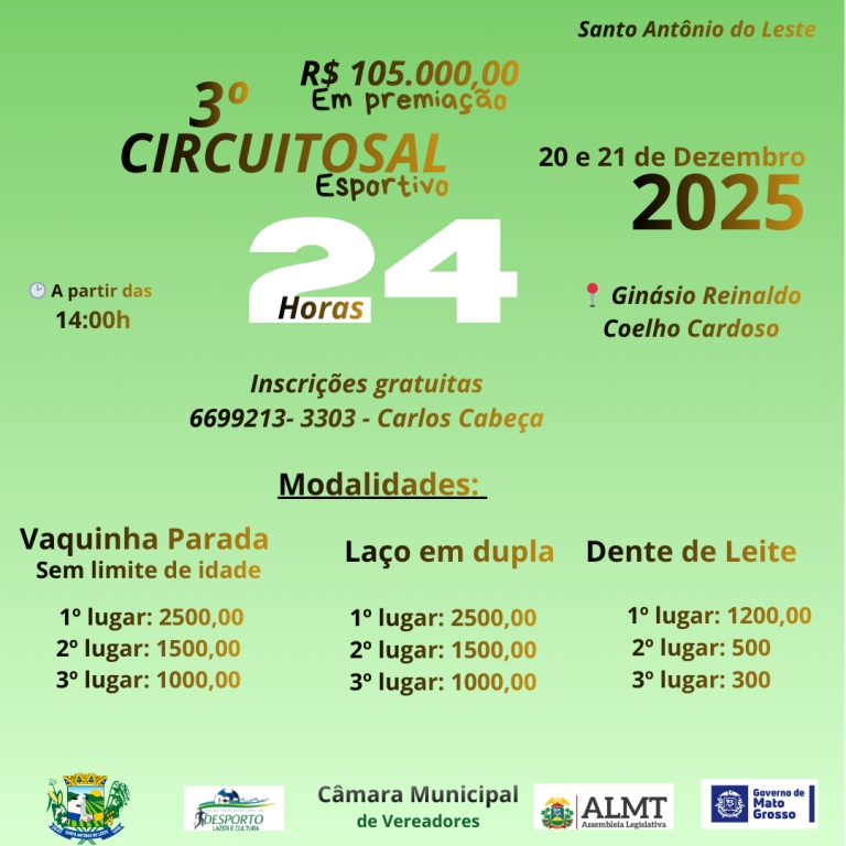 O 3º Circuito SAL Esportivo 2025 é uma realização da Prefeitura Municipal de Santo Antônio do Leste, por meio da Secretaria Municipal de Desporto, Lazer e Cultura, com recursos provenientes da Secretaria de Estado de Cultura, Esporte e Lazer (SECEL), viabilizados por indicação do deputado estadual Beto Dois a Um.